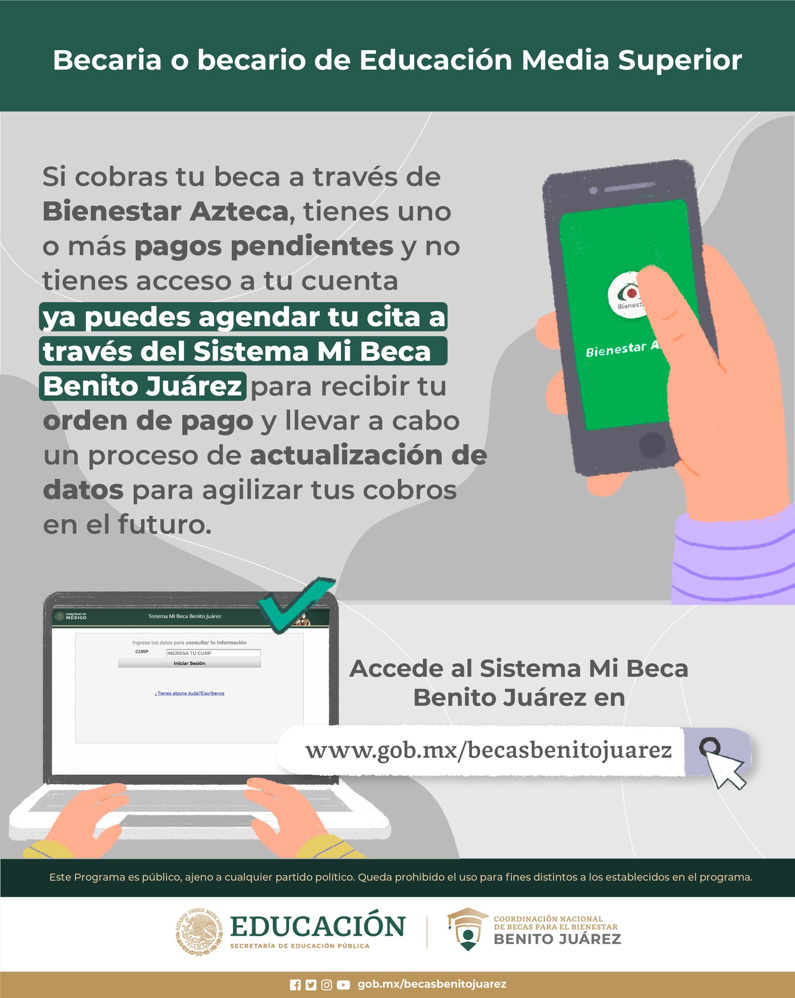 Mediante el Sistema Mi Beca Benito Juárez. Beca Universal para estudiantes de Educación Media Superior Benito Juárez Contribuir al bienestar social e igualdad mediante el otorgamiento de becas para la permanencia de alumnas y alumnos de las instituciones públicas de Educación Media Superior del Sistema Educativo Nacional. La Beca Benito Juárez es un apoyo gubernamental del orden Federal que consta en la entrega de 1600.